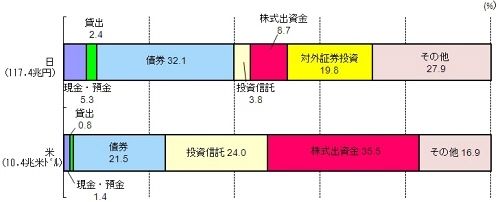 日米の資産配分比較(年金基金)  出所:日本銀行