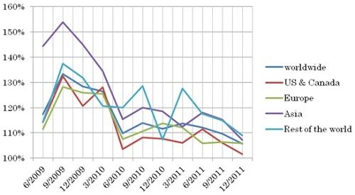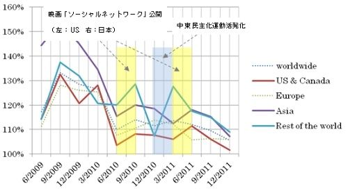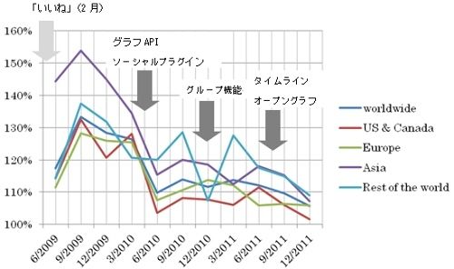 担当者の頑張りはシステム利用者を増やさない? フェイスブックの地域別「1日のアクティブユーザー(DAUs)」伸長率推移 (画像1/3) フェイスブックの機能追加のヒストリー (画像2/3) 利用者増加に影響を与えたと思われる出来事 (画像3/3) 担当者の頑張りはシステム利用者を増やさない? この写真の記事を読む
