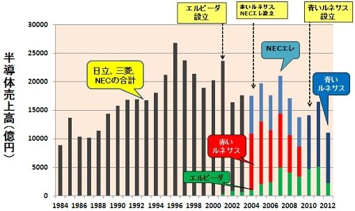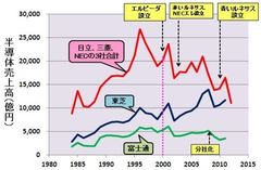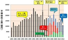 図2 日立、三菱、NEC(3社の合計)と、合弁・分社した半導体メーカーの売上高 (出所:電子ジャーナル『半導体データブック』を基に筆者作成)