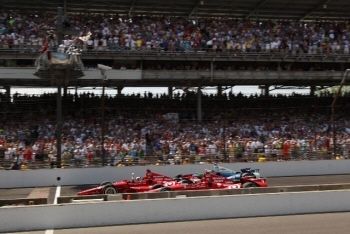 第96回インディアナポリス500マイルレース、ゴールの瞬間。佐藤琢磨のクラッシュによってフルコースコーションの中の「イエローフィニッシュ」となった。先頭で右拳を突き上げているのがダリオ・フランキッティ。彼自身3度目のインディ制覇である。その内側(写真手前)をチームメイトのディクソンが行くが、1周前にはここに佐藤琢磨が並んでいたのである。彼のインディ参戦は今年が3年目。コース上の空間に設けられたフラッグタワーでチェッカードフラッグが振られている。その真下の白線がフィニッシュラインであり、そのすぐ先にある赤茶色の帯が「ブリックヤード」の名残として残されている煉瓦の帯。(写真提供:本田技研工業)