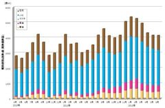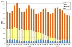 電力供給総量そのものは、2011年8月と2012年1月が「ピーク削減」の傾向が見られることを除いて「目に見えて」減ったとは見受けられない。2012年6月の減少傾向は天候不順(=気温低め)の影響が大きいと見た方が論理的。すなわち、大規模消費者(企業など)は様々な節電努力を積み重ねている一方、庶民生活を核とした一般社会の「節電」の成果は、実質、ほとんどない。“掛け声”と“我慢”の節電では、実効的成果は得られない、という現実が読み取れる。もちろん、原子力発電が急減したの部分を補っているのは、火力発電の増大=その結果は直接、CO2排出量増加に結びつく、以外の何物でもない。