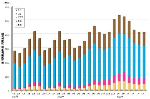 公開されている「受発電状況」から整理した日本の月刊発電総量と、そのエネルギー源別内訳(他社受電と揚水発電についてはグラフ化していない)。ついに2012年6月で「原子力発電“ゼロ”」になった。
