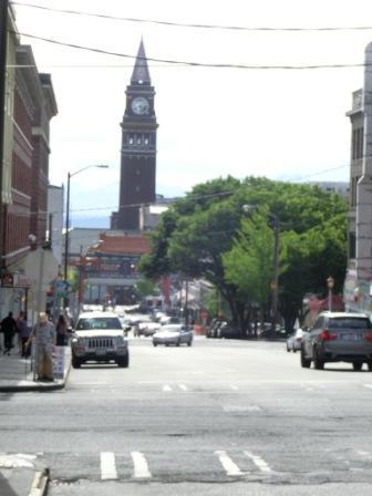 インターナショナル・ディストリクトのはずれから中華門と時計台を望む