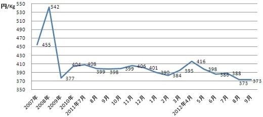 ナチュラルチーズの国際価格の推移 (資料:財務省「貿易統計」より筆者作成)
