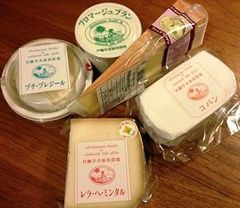 共働学舎のチーズ。中央奥から右回りに、フレッシュチーズの「フロマージュブラン」、アルプス地方で伝統的な「ラクレット」、白カビタイプの「コパン」、大型ハードタイプの「レラ・へ・ミンタル」、酵母を使用した「プチ・プレジール」。ラクレットは1998年に開催された第1回オールジャパンナチュラルチーズコンテストで最優秀賞を受賞。