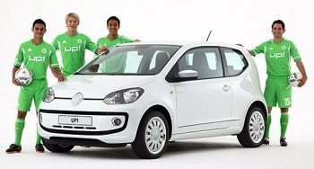 4人の大人がちゃんと収まる空間としてのフォルクスワーゲン「up!」。VWの地元のプロチーム(ブンデスリーグ)、ヴォルフスブルクのサッカー選手たちとともに。左から3人目は長谷部選手。(写真提供:Volkswagen AG)