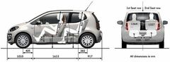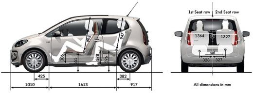 up!の側面図と前面図に描かれている人体モデルはアメリカ男性の体型の95%をカバーすると規定されている「AM95」サイズのはずで、そうだとすれば身長187センチメートルの大柄な身体である。それが4人、きちんと座った周囲を包み込み、かつ「住み心地良い」空間を形作る。走行機能要素は現代の技術が許すかぎり凝縮して組み込む。これがスモールカーパッケージングの基本。(図版提供:Volkswagen AG)