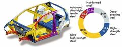 up!の車体骨格。パワーパッケージを収めるエンジンルームがとても短いことがよく分かる。車体に使われている素材を示す円グラフ(重量ベース)が示すのは右上から時計回りに、通常の軟鋼、高張力鋼板、超高張力鋼板、改良超高張力鋼板、熱間成形を行う超高張力鋼板。日本のスモールカーでこうした最新素材を最新工法で成形して組み立てた骨格はまだない。骨格各部の断面の「深さ」は、薄板を使っても十分な剛性を得るための基本となる設計である。(図版提供:Volkswagen AG)