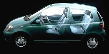 初代ヴィッツの室内レイアウトを示す透視写真。トヨタのスモールカーを当時の世界基準の最先端にまで進化させるべく、グループ全体から有能な技術者を集めた特別チームを組み、まずパッケージングレイアウトから徹底的に考え、組み立てたクルマだった。インスツルメントパネル、シート、さらにはリアウィンドウワイパーまで、新たな設計と製法を開拓し、ここから始める大量生産によってコストを回収するという取り組みも行った。(写真提供:トヨタ自動車)