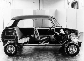 こちらは「ザ・オリジン」、英国の自動車産業が1950年代に生み出し、その後のスモールカーのあり方を決定づけたBMC(オースチン、モーリスなどの合同企業体)ミニを車体中心面で切断して、内部レイアウトを見られるようにした実車カットモデル。これまた「居住空間ありき」から始まるきわめて稠密な設計が見ただけで伝わってくる。ホイール径10インチという当時も今も例を見ない小径タイヤに至るまで、機能要素の全てを徹底的に考え尽くしている。これも今日の衝突要件などには適合しない。それらを満たしつつ、同じだけの稠密さで創造的な「デザイン」を描けば、そこに次世代をリードするスモールカー像が生まれる。(写真提供:British Motors Corporation)