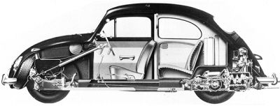 フォルクスワーゲン(タイプI:いわゆる「ビートル」)の「パッケージングデザイン」を示す横断面画。1930年代半ばにこれだけ稠密な空間設計を実現していたのである。人が座り、移動するための空間がまず中央にあり、その周囲に無駄なく走行機能要素を配置していった結果のリアエンジンレイアウトであることがよく分かる。しかも車室床面中央に盛り上がった小さなトンネルが、車体骨格の「背骨」を形成する。見ていて飽きない、「絵画」のような美しさがある。もちろん今日の社会的規範、特に衝突安全性の要件に対しては、こうしたミニマムデザインでは通用しない。(図版提供:Volkswagen AG)