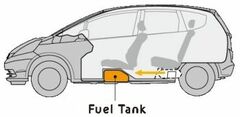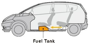 ホンダ「フィット」の基本レイアウト。その特徴は常識的には後席下部の床下に収める燃料タンクを前席直下に置いたことにある。この発想によってリアシート座面を上にたためば、天地いっぱいの空間が生まれる形になった。背が高く身体を起こして座る空間では座面下の空間が大きく、それを後席側で活用しようというアイデアである。全ての状況において「正解」というわけではないが。図は2代目フィットのものだが、初代が成功を収めたのでその基本構成は変えずに継承している。(図版提供:本田技研工業)
