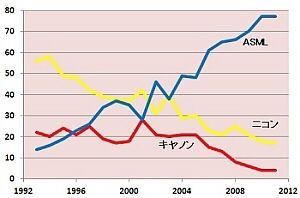 図1 ASMLの企業別シェアの推移、出所:電子ジャーナル『半導体製造装置データブック』(1994~2012年)