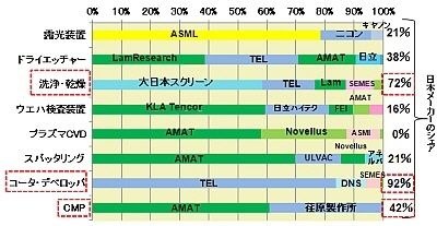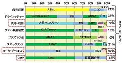 図7 主要製造装置分野のメーカー別シェア(2011年)、Electric Journal 『半導体製造装置データブック』を基に筆者作成