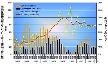 図4 半導体露光用エキシマレーザー光源出荷台数とギガフォトンのシェア、出所:ギガフォトンHP、技術情報、Technical Paper