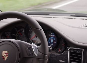 アウトバーン走行中のパナメーラS E-Hybrid。中央の大径メーターで時速123キロメートル、エンジン回転は「ゼロ」、つまり停めたまま電動走行していることが分かる。その右のメーターでは電池残量がまだ10分の7あって、このペースで18キロメートルのEV走行が可能、と表示されている。(写真:筆者)