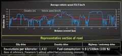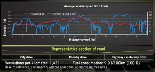 実用燃費の評価と解析の一典型としてポルシェが使っている「シュトゥットガルト周回コース」。グラフの青色の線が車速で、発進停止を繰り返す区間(市街地と周辺エリア)、時速70~90キロメートルで走る郊外路、時速120キロメートル前後を維持するアウトバーンが組み合わされている。赤色の線は道路の勾配を示す。ここを通常のガソリンエンジン搭載、スタート・ストップ(アイドリングストップ)付きのパナメーラで走った結果は平均時速53.5キロメートルで平均燃費100キロメートル走行にガソリン9.9リットル、日本流には1リットルあたり10.1キロメートル。(図版:Porsche)