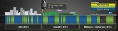 市街地~郊外路~アウトバーンというコースを走った時に燃料消費を削るアイテムの作動状況を示す。黄色は通常エンジン車両のスタート・ストップ(アイドリングストップ)作動、緑色はさらに減速や下り坂でアクセルを離した時にエンジンを止めて駆動から切り離す「惰行」機能。そして青色は電動駆動。途中、市街地で仕事や買い物で止まっている間にプラグインで充電すれば、青い帯の中はエンジンを切ったまま電動駆動で走れる、ということを示す。(図版:Porsche)