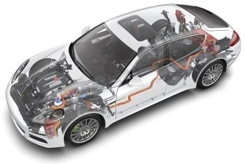 2013年7月末から欧州市場に出荷開始。日本へも年内には投入されるポルシェのプラグインハイブリッド第1作、パナメーラS E-Hybrid。スーパーチャージャーを装着したV型6気筒、エンジンとの間にモーターを組み込み8速ATと組み合わせた動力機構から後輪へ駆動軸が伸びる。車体後部の荷室下部に大容量のリチウムイオン電池を収め、そこから前部の電力制御系、さらにモーターへとオレンジ色の太い電力配線が伸びる。(画像提供:Porsche)