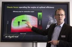 「ワークショップ」らしく基礎的な理論の確認に始まり、現実の解析から導かれる最新技術までのプレゼンテーションが3セッションと実車体験が用意されていた。ガソリンエンジンの熱効率マップ、より具体的には燃費率(ある仕事量に対して消費される燃料量)の分布状況という基礎から「ハイブリッド制御の原理構築」を語ってゆくこの分野の責任者、マテアス・レドラー博士。(写真:筆者)