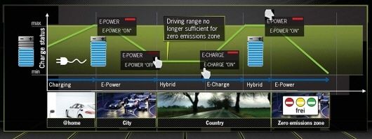 自宅などで長時間駐車している時に電力網につないで電池を充電しておき、市街地など騒音や排ガスが問題になるゾーンではその電力を使って電動駆動で走り、電力がなくなったらエンジンで走って航続距離を伸ばす、というのがプラグインハイブリッドの「定石」だが、ポルシェとしてはドライバー自身が今走っている場所、これから行く場所を考えて「E-POWER」(電動走行)、「E-CHARGE」(エンジンに負荷をかけて発電)を選んで使い分けることを推奨する。いずれネットワークと接続しつつ移動プランを組み立て、その中で電動走行、エンジン充電をクルマの方が使い分けるインテリジェント化も想定。(図版:Porsche)