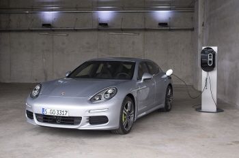 「プラグイン」状態のパナメーラS E-Hybrid。専用の充電器は欧州の220~230ボルト電源につないで電池容量の常用範囲(おそらく全容量9.4kWhの中で最大80%)を4時間足らずで送り込むことができる。この日も通常の家庭用電源からコードを引っ張っていた。世界各国から集まったジャーナリストの同乗体験ではホッケンハイム・サーキット近隣の集落の中を抜け、アウトバーンを走るという28kmほどのコースを合計42回も走行。常に3~4名乗車、エアコン作動。強い加速や時速200キロメートルに達する瞬間もある、という走り方で、平均燃費は1リットルあたり22.7キロメートル(電力使用量は不明)だったという。(写真:筆者)