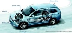 アウトランダーPHEV。前後にモーターを置いて、それぞれ2輪を駆動する電動4輪駆動を基本とする。フロントにモーターと一体に置かれたエンジンは、電池の残量や負荷(加速の強さ)に応じて始動、発電機を回してモーターに電力を供給する(シリーズハイブリッド状態)。通常は時速120キロメートル以上、電池残量が少なくなった状態では時速70キロメートル前後からクラッチをつないで前輪を「直結」で駆動する。(図版:三菱自動車)