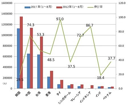 (データ元、JNTO 2011-2012年1~8月の比較)