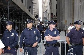 オキュパイ・ウォールストリートの警戒にあたるニューヨーク市警の巡査ら(ウィキペディアより)