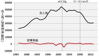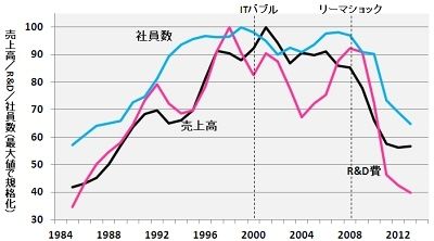 図3 最大値で規格化したNECの売上高、R&D費、社員数