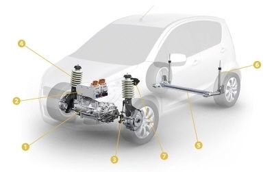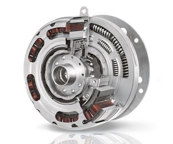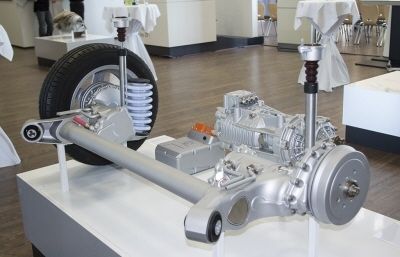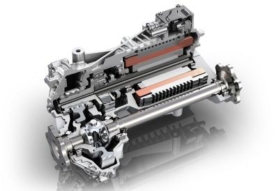 電気自動車のモーターはどこまで進化しているのか ZFも永久磁石回転子・同期制御型モーターを実用製品としても供給している。このカットモデルは、エンジンの出力軸とトランスミッションの間に組み込み、多板クラッチを介して発進デバイスとしても機能しつつ、駆動と回生も行うハイブリッド動力化モジュール。外周部に銅線を巻いたコイルが並び、その内側に磁石を並べた回転子が組み込まれている。(写真:ZF) (画像1/6) ZFの「エレクトリック・アクスル・ドライブ」、主要機構部の断面構造図。誘導モーター(断面で茶色に示されている部分がコイルの銅線)をコンパクトに組み込み、その出力軸に遊星歯車の減速機(中央やや左)、その出力回転を大小の平歯車で減速した内部にデファレンシャルギア(傘状の歯車4個が向かい合っている部分)を組み込んで、左右に駆動軸を伸ばす。(写真:ZF) (画像2/6) ZFの新技術展示・体験試乗会に用意されていた「エレクトリック・アクスル・ドライブ」の開発車両。ベースになっているのはスズキのコンパクトカー、スプラッシュであり、それをEVコンバージョンしたGERMAN E-CARS社の「ストロモス」にZF社が開発中の技術要素を組み込んで走らせている。加速は機敏にして滑らか。発散する電気+機械騒音も小さい。(写真:ZF) (画像3/6) 「ストロモス」の、元々はエンジンルームだった空間に組み込まれたZF「エレクトリック・アクスル・ドライブ」システム。見えているのは電力制御系を収めたケースと動力配線(オレンジ色被覆)であり、誘導モーターと減速機構を一体化したパワーパッケージそのものはこの下に低く収まり、すっかり隠れている。(写真:筆者) (画像4/6) 今回の試験車両の1台に組み込まれていた「エレクトリック・アクスル・ドライブ」と「超軽量シャシー・コンポーネンツ」。1=誘導モーターと減速機構を一体化したパワーパッケージ。2=電力制御システム(インバーター)。3=車軸支持部(ハブキャリア)まで一体にしたC(カーボン)FRP成形品のダンパー・ストラット。4=プラスチック製コイル・スプリング。5=C(カーボン)FRP製のアンチロールバー。6=アルミ合金の軽量外筒を持つダンパー。7=コックピット内に設置された駆動特性切り替えロータリースイッチ。(写真:ZF) 拡大画像表示 (画像5/6) 今回、前輪駆動用エレクトリック・アクスル・ドライブ(後方)とともに展示されていた、トーションビーム形態のリアサスペンションにモーターと減速機構を一体化した後輪用電動駆動モジュール。写真左側が車両では前側になり、車体側ピボットから車輪を保持するために後方に伸びるトレーリングアームの後端近く・内側にモーターを組み込み、減速機構を介して車輪を駆動する。後輪側では左右輪を独立して駆動することで、車両の旋回運動を制御する「トルクベクタリング」が可能になる。(写真:筆者) (画像6/6) 電気自動車のモーターはどこまで進化しているのか この写真の記事を読む