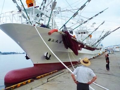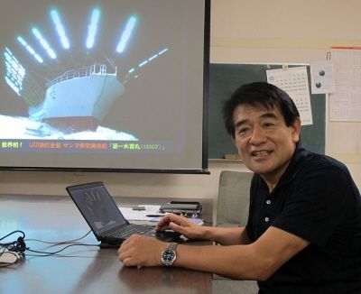 稲田博史氏。博士(水産学)。1954年、福岡県生まれ。東京海洋大学大学院海洋生物資源学部門准教授。東京水産大学(現在の東京海洋大学)修士課程修了。北海道大学大学院水産学研究科博士課程を経て1985年から東京水産大学へ。助手、助教授から現職。専門は漁業生産技術学。水産庁漁業新技術開発委員会委員なども歴任。著書に『漁灯を活かす技術・制度の再構築へ』(恒星社厚生閣、共編)『スルメイカの世界』(成山堂書店、共著)などがある。背景に映っているのはLED漁灯をつけた「第1太喜丸」。