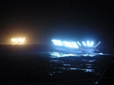 右前の青白い光はLED漁灯、左奥の黄色い光は白熱漁灯のさんま棒受網漁船 (画像提供:稲田博史氏)