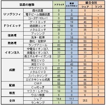 表1 アプライド、東京エレクトロン、統合会社の各装置におけるシェアとランキング