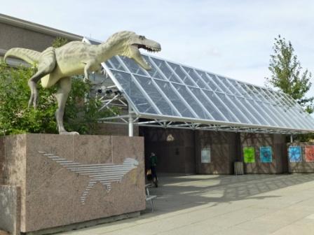 ロイヤル・ティレル古生物学博物館前で出迎えてくれる恐竜のオブジェ