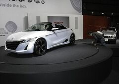 自動車専門メディアの誌紙上では「(2人乗りオープン、エンジンをキャビン背後に横置きしていた)ビートの再来」として取り上げられることが多かったホンダ「S660」のスタイリングを訴求するためのモックアップ。右手奥にはホンダにとって「初めての4輪市販車」だったS360が展示されている。これは当時の軽自動車枠(全長3.3メートル×全幅1.3メートル、エンジン排気量360cc)に収めたもので、車体幅を拡げ、排気量を500ccとしたS500とともに51年前のモーターショーに出品された。ホンダの展示物の中では、このS360と、1964年にF1グランプリに初めて参戦した時のRA271型、初代スーパーカブの3車が「人間と企業の知恵と労力の結晶」ならではの訴求力を持って佇んでいた。(撮影:筆者)