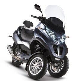 前を2輪にして、それぞれにストローク(伸縮運動)しつつモーターサイクルとしてリーン(旋回時内傾)し、その全体を転舵させるメカニズムを組みこんだスクーター、ピアッジオMP3。2006年に市場投入され、日本でも販売されている『実用品』。例えばヨーロッパの都市に多い石畳の路地でも転倒の不安なく走り回れて、しかもモーターサイクルらしい運動性も持つことから新しいカテゴリーとして認知されるまでになった。(写真:Piaggioホームページより)