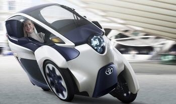 「i-ROAD」の走行イメージ。前2輪はリーディングアーム(車輪から後に伸びた腕の先を車体に固定、そこを揺動軸とする)、後1輪はトレーリングアーム(車軸から前に伸びた腕の先を車体に固定、そこを揺動軸とする)の車体側支持点で大きく転舵して低速小回りする、というサスペンション設計では自動車らしい速さで直進、旋回できる資質を実現するのは難しい。 (写真:トヨタ自動車)