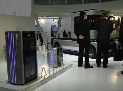 ダイハツの展示の主ステージを飾ったのは2代目「コペン」だったが、もう1つのステージには自社開発を進めている液体燃料を使う燃料電池の最新開発品と、それを搭載して電動走行する実働コンセプトカー「FC凸(デコ)DECK」を展示していた。左手前に見える大小の箱は燃料電池を定置型、あるいは可搬型の電力源として使うというコンセプトの提案。左手奥のトラック頭部を想定した角形コンセプトカーは、この形で軽自動車の寸法枠に収まっていて実走できる。(撮影:筆者)