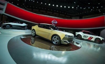 日産が「ショーの華」としてステージに展示した3台。左から「ブレードグライダー」「iDXフリーフロー」「iDX NISMO」。ブレードグライダーは2012年ル・マン24時間レースの特別枠に日産の支援で出場した「デルタウィング」の台形4輪配置に新しいスタイリングを試みたもの。iDXは1967年に登場して日米で一時代を画したブルーバード「510型」を下敷きにリメイクしたスタイリングスタディで「iDX NISMO」は当時アメリカの欧州型レースに出場していたBRE(ブロック・レーシングエンタープライゼズ)のマシンのカラーリングを再現。いずれも「デザイナーの遊び」としての要素が強い。(写真:日産自動車)