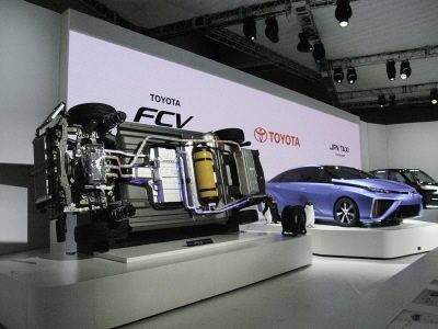 トヨタのショーブースの中で「明日のクルマ」像を語りかけるステージに並べられた燃料電池(Fuel Cell)とモーターを動力源とする乗用車の骨格概念模型とその上に構築することを想定したコンセプトカー「FCVコンセプト」。居住空間と動力システムをどう“パッケージング”するか、それをどんなメカニズムとものづくりによって実現するか、という基本的な設計感覚が、現状の自分たちの量産手法に縛られていて、次の世代に向かう時に求められる創造性が見えてこないのが残念。(撮影:筆者)