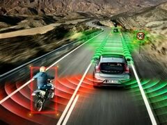 最新の市販車に実装されている衝突抑止・警告などのドライバー支援システムのイメージ。高速道路や郊外路などを巡航している中で、前走車の存在とお互いの速度、距離の関係を検出、必要ならば自動ブレーキも行う。ドライバーにとって死角になりやすい斜め後方についても、並走している車両(この場合はモーターサイクル)を検出して、車線変更を行わないように警告、ステアリングを切るのを抑えるような制御を加えるものも現れている。(図版:Volvo Car Group)