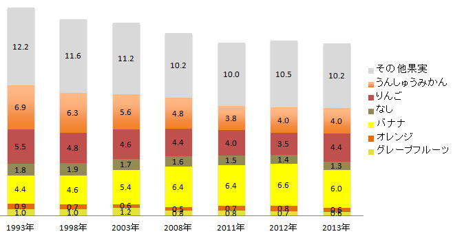 果物を食べなくなった日本人 1人あたりの生鮮果実年間購入量。単位はキログラム。2人以上の世帯 (参考:総務省「家計調査」をもとに作成) (画像1/2) 世代別の1日あたりの果実摂取量の変化。生鮮果実、果実缶詰、ジャム、果汁類の重量の合計。単位はグラム (参考:厚生労働省「国民健康・栄養調査」をもとに作成) (画像2/2) 果物を食べなくなった日本人 この写真の記事を読む