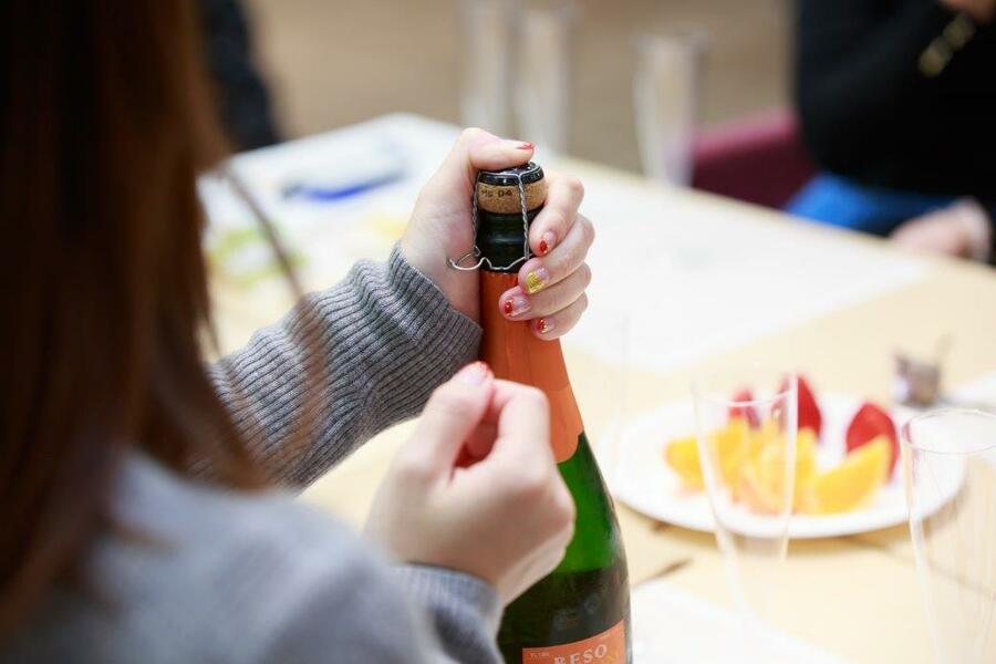 瓶の首の部分をしっかり握り、栓が飛ばないように、指で押さえながら慎重に針金を緩める