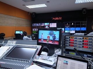 副調整室。ここからスタジオに演出意図が伝えられたり、収録された映像が合成されたりする