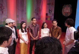スタジオで土屋礼央さん(右端)よりインタビューを受ける、カンボジア代表チームとメンターの中村英誉さん(左端)