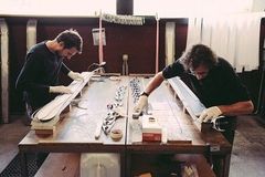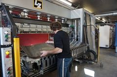 ジャコメット氏は片麻岩を使った板の断面を見せてくれた。「絶対に折れないスキーです」とのこと。