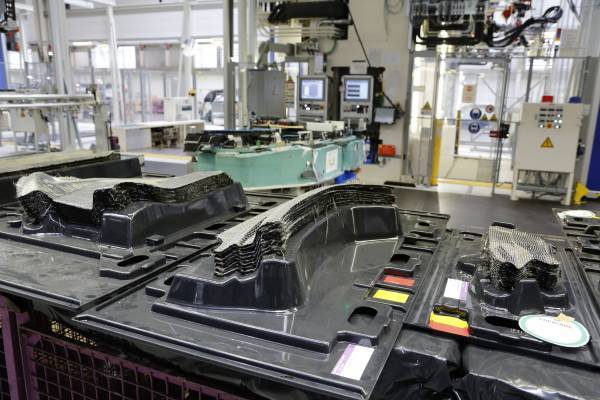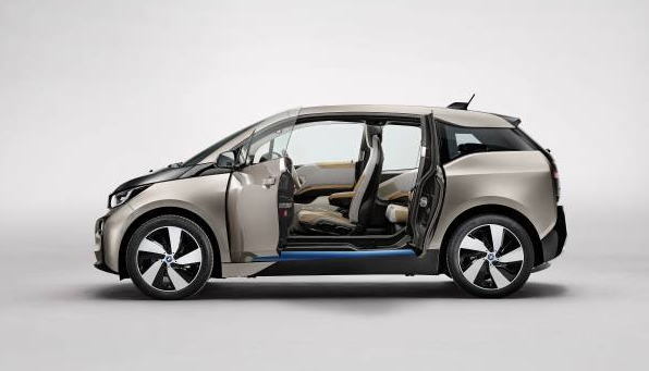 BMW i3。「観音開き」のドアを取り巻く開口部を持つ車体外郭(ボディシェル)の主要構造体は、片側2枚のドアも含めてC(カーボン)FRPの成形材を接着して造られている。キャビンの空間は4人の大人が快適に移動するのに十分な寸法と居住感を持っている。車室床が高いのは別に紹介するように、電池を床下に収めつつ走行機能要素の骨格(フレーム)を全通させるレイアウトのため。(写真:BMW AG、以下同)