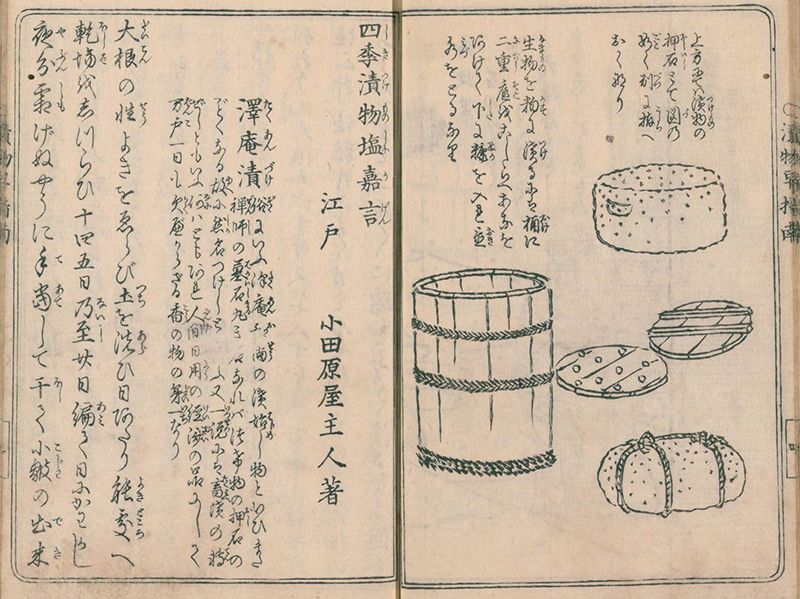 1836(天保7)年刊の小田原屋主人著『四季漬物塩嘉言』に見られる漬け物道具の数々。右上から下にかけて、「押し石」「鏡」「押し石」、左は榑を竹箍で締めた「結桶」(所蔵:国立国会図書館)