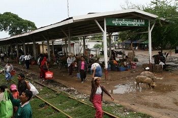 ミャンマーの線路は生活道路でもある。作業の合間に親子連れが通り過ぎた